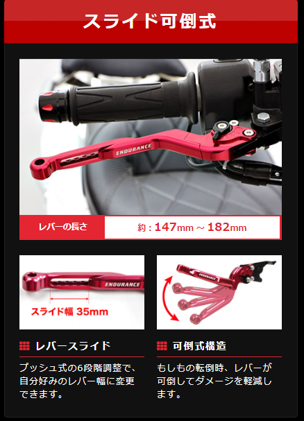 こちらは純正とあまり変わらないタイプですが、レバーの先端が折れやすくなっているため、転倒時に破損する場所が少なく設計されているのが特徴です。さらに長さが170mmと138mmの2種類が選べるのでお好きな方を選ばれたらとおもっています。